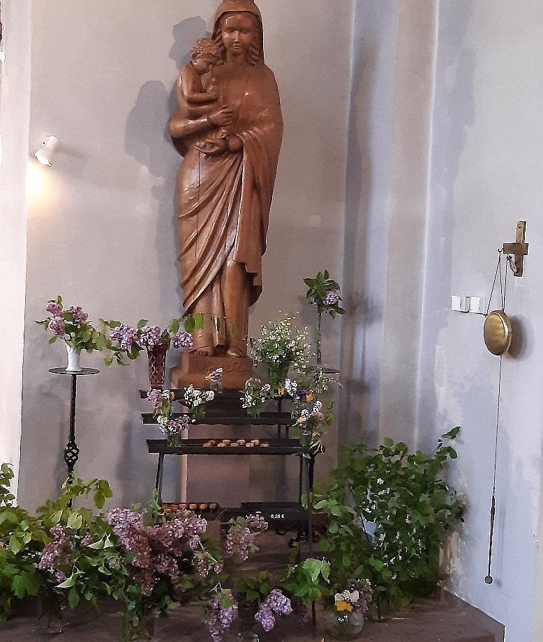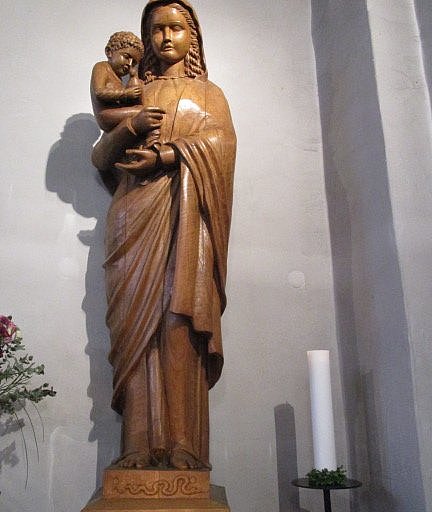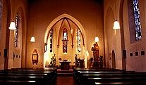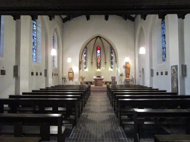 Die Pfarrkirche, die 1873/76 errichtet wurde, wurde im Februar 1940 durch einen Brand zerstört und konnte, trotz Kriegszeiten und NS-Herrschaft, bereits Ostern 1941 neu eingeweiht werden. Foto Kirche Innenraum Durch die bunten, bleiverglasten Kirchenfenster fällt ein gedämpftes Licht, das dem Kirchenraum eine besondere sakrale Atmosphäre verleiht. Die Kirche ist im neugotischen Stil ausgeführt. Eine Besonderheit ist die Abtrennbarkeit des Kirchen-raumes unter der Empore durch Glasschiebetüren, in deren Scheiben sakramentale Motive abgebildet sind. Unter der Empore befindet sich der Wendelinus-Altar. Über dem Altarbild ist ein Fliesenbild angebracht, das Christus am Kreuz darstellt, wobei das Kreuz als Lebensbaum abgebildet ist. Besondres erwähnenswert ist auch die 2,15 m hohe Madonnenfigur aus Eichenholz. Sie von dem Künstler Heinrich Kreuchen, geschaffen, der lange in Dombach wohnte.