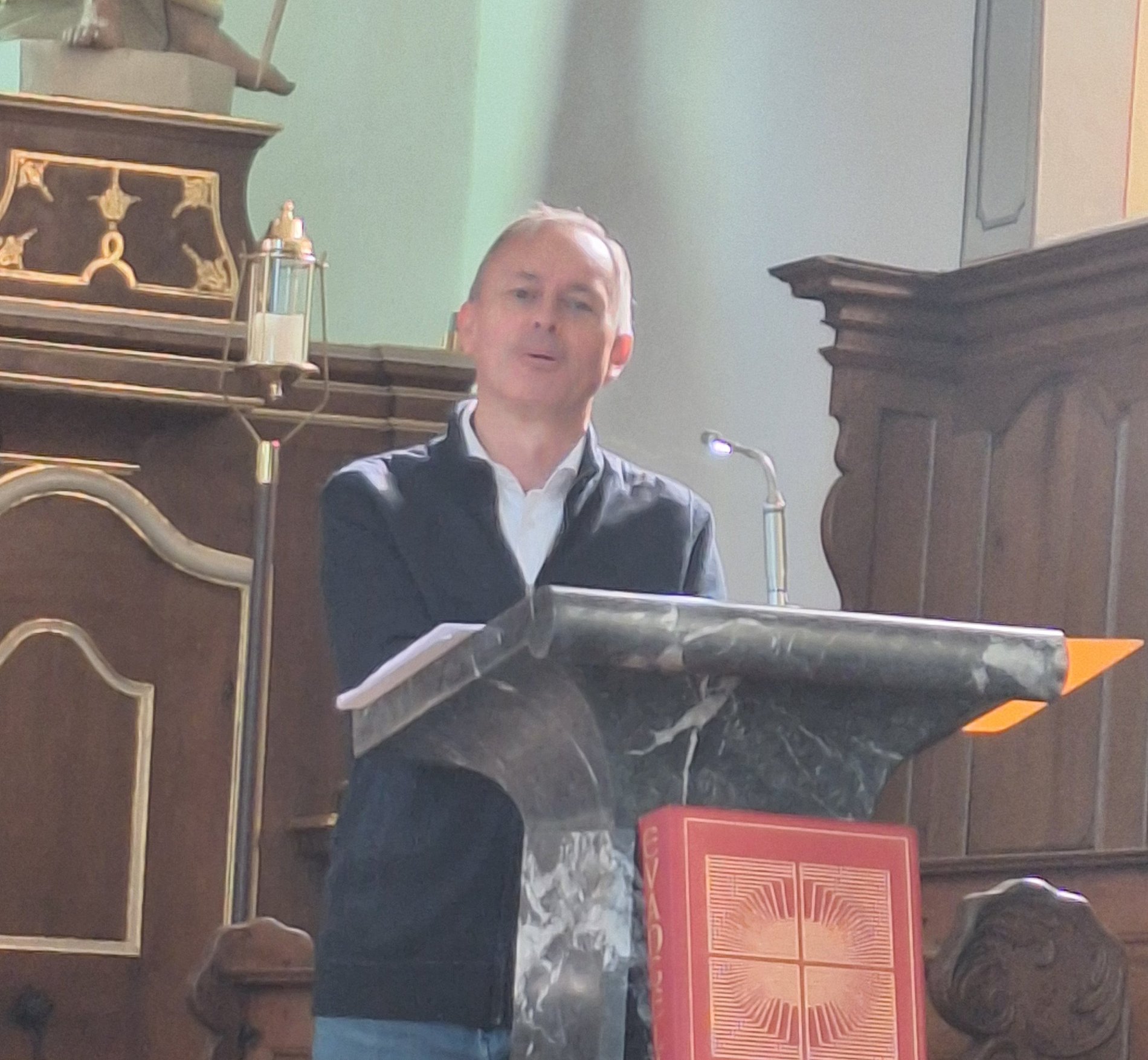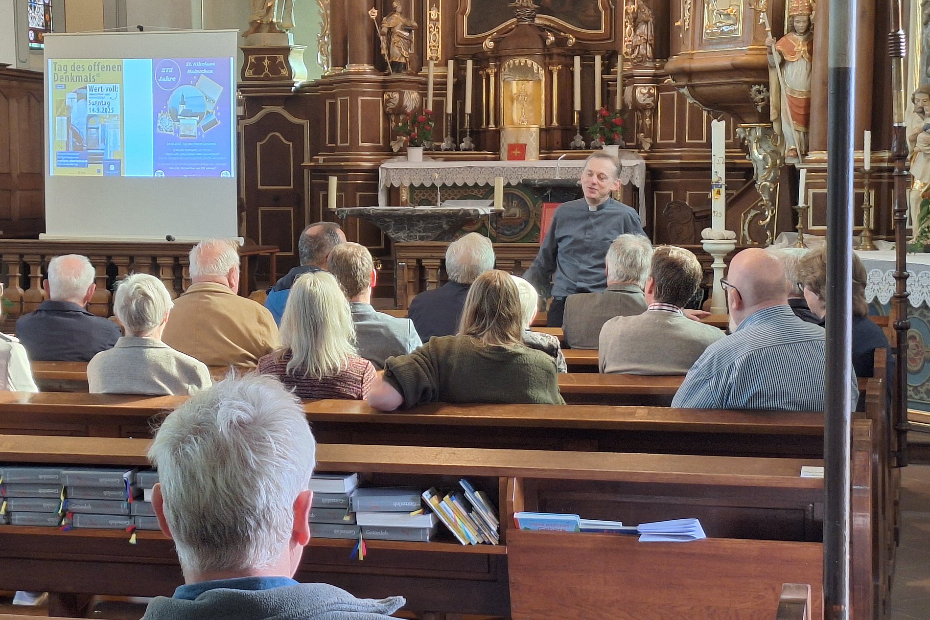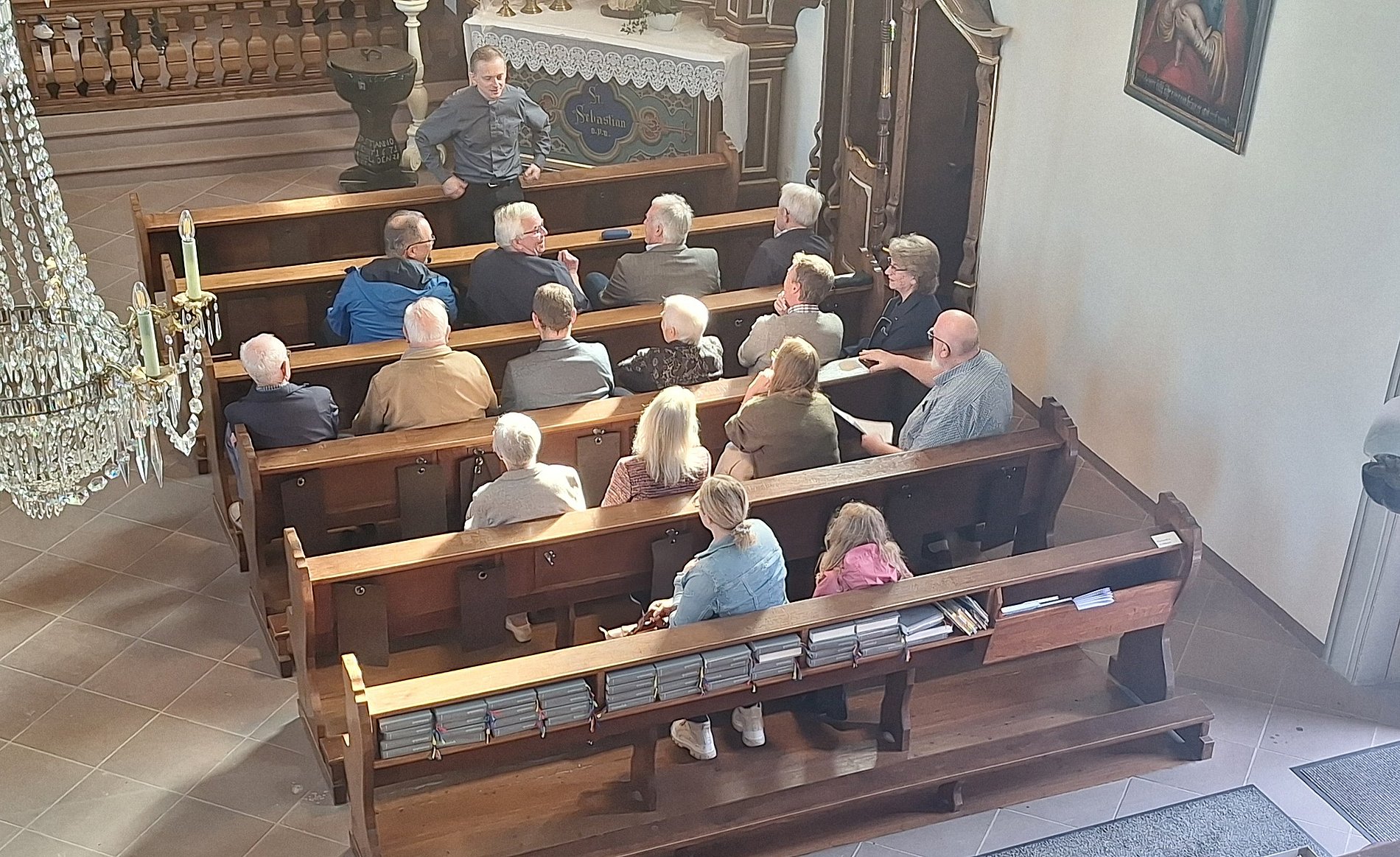 Anschließend nutzten rund 25 Teilnehmende die Gelegenheit, mit Pfarrer Wichmann ins Gespräch zu kommen. Thema war die Zukunft von Kirchengebäuden angesichts sinkender Gläubigenzahlen und der Kirchlichen Immobilienstrategie (KIS). Pfarrer Wichmann verglich den schmerzlichen Abschied von Kirchengebäuden mit dem Tod eines geliebten Menschen unter dem man emotional sehr leide, auch wenn man rational zugebe, dass es zum Besten des Verstorbenen und der Hinterbliebenen gewesen sei. Sein Fazit: „Eine lebendige Gemeinde vor Ort ist der beste Garant für den Erhalt unserer Kirchen.“