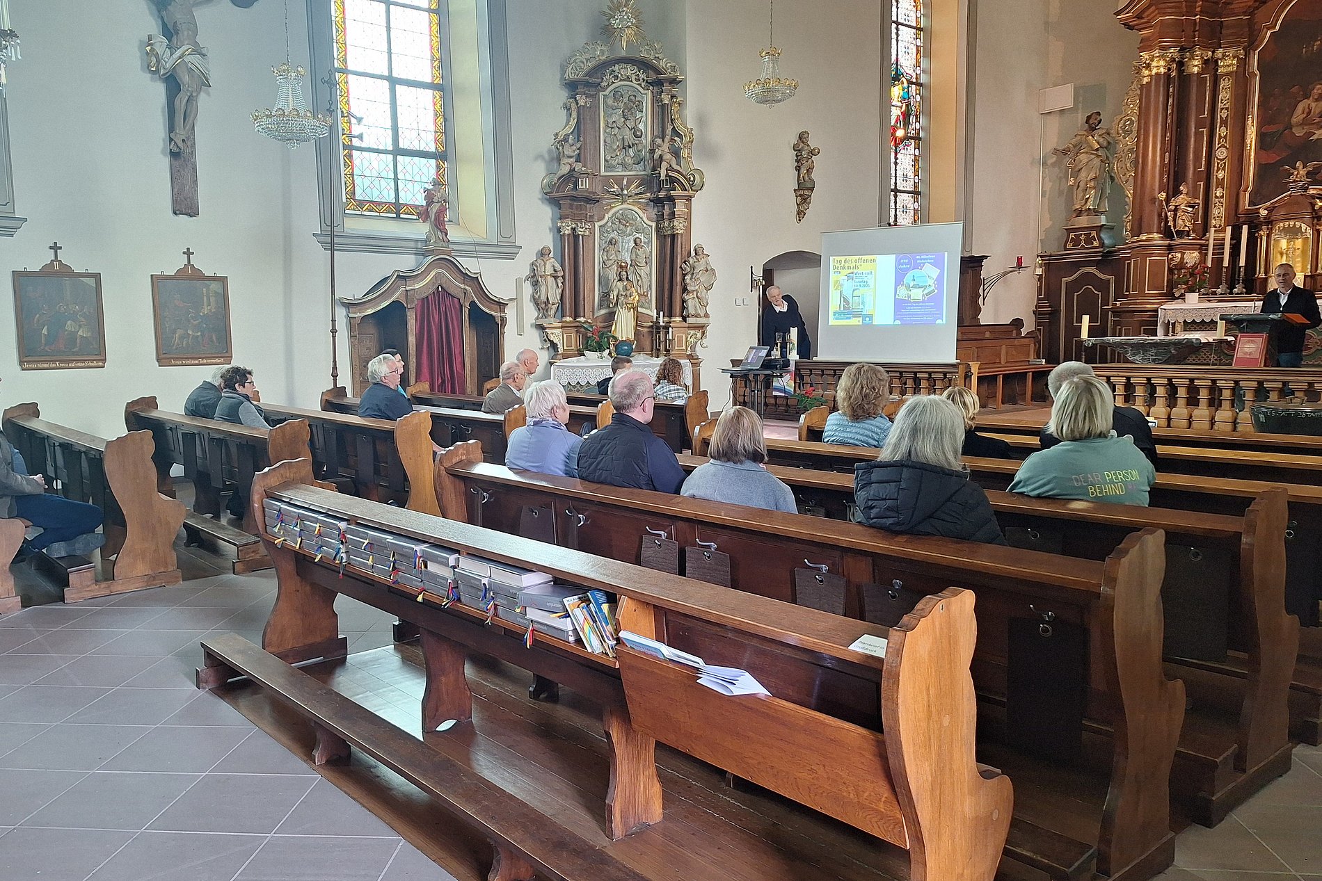 Am späten Vormittag und am Nachmittag folgten vor ca. 45 Zuhörern die Vorträge des Archivteams unter dem Titel „Am Ziel: Kirchenbau vor 275 Jahren“. Anhand von Originalquellen zeigten sie auf, wie in nur wenigen Monaten zwischen Frühjahr und Spätherbst 1750 die heutige Kirche erbaut wurde – trotz finanzieller Hürden und politischer Spannungen im Amt Camberg. Viele Zuhörer waren beeindruckt von der Leistung der damaligen Bauleute.